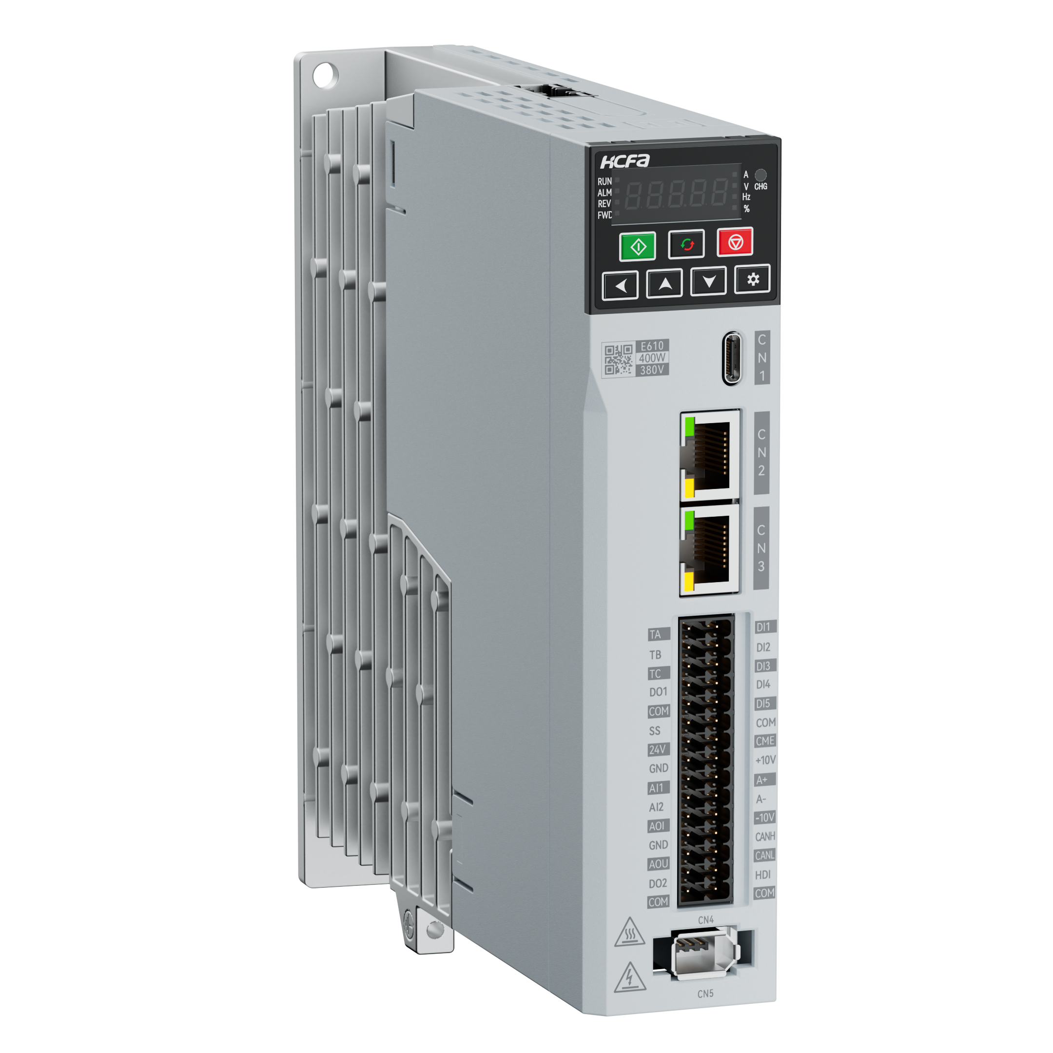 The HDv-E610 series frequency converters are positioned as general-purpose low-power frequency converters, covering a power range of 0.4~7.5kw. They feature built-in Modbus and CANOpen communication, with the ability to expand EtherCAT fieldbus. The entire series comes standard with digital and analog input and output, and provides precise fault protection functions.