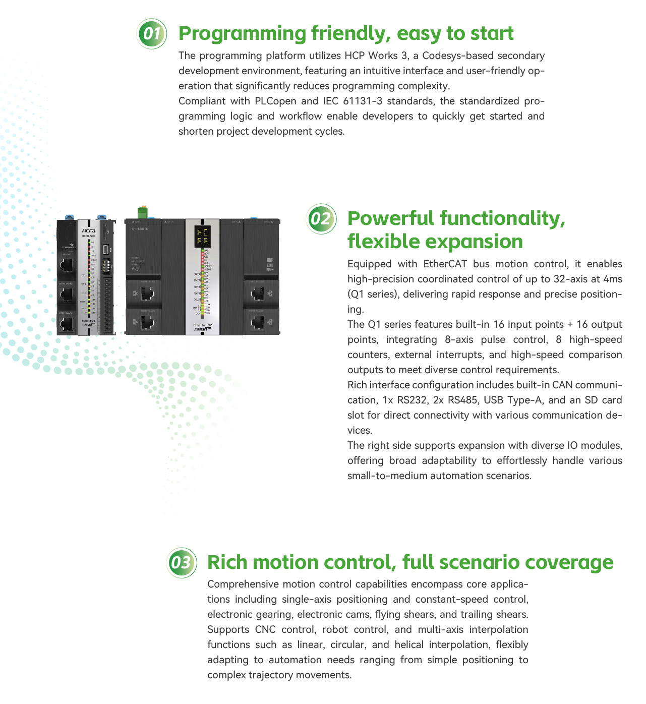 As the first generation product of the Q series PAC, the HC-Q series has undergone years of refinement, creating an efficient and stable automation controller platform. It boasts a rich set of interfaces. Apart from the Q0, the CPU main module comes with high-speed IO, allowing for the control of stepper motors or servo drives in required scenarios. It also features built-in serial and Ethernet communication interfaces, facilitating online use for small and medium-sized devices. The main body comes with a U-disk interface, enabling program downloads via U-disk. On the right side, various types of modules can be expanded, meeting the needs of small and medium-sized devices.