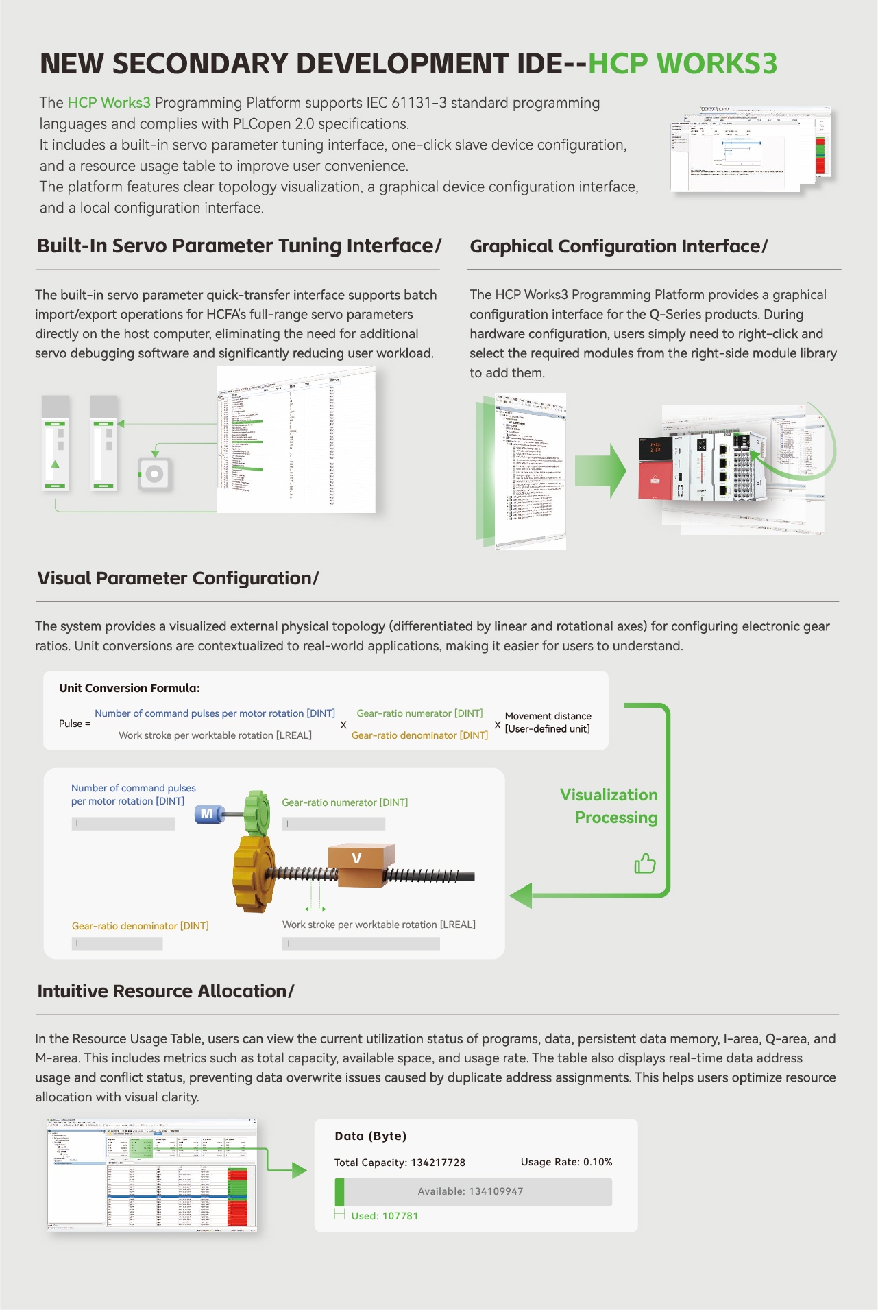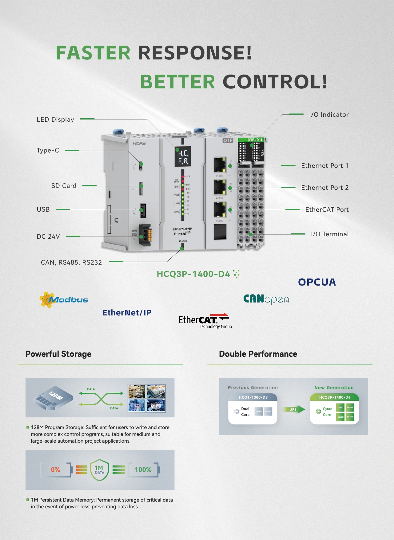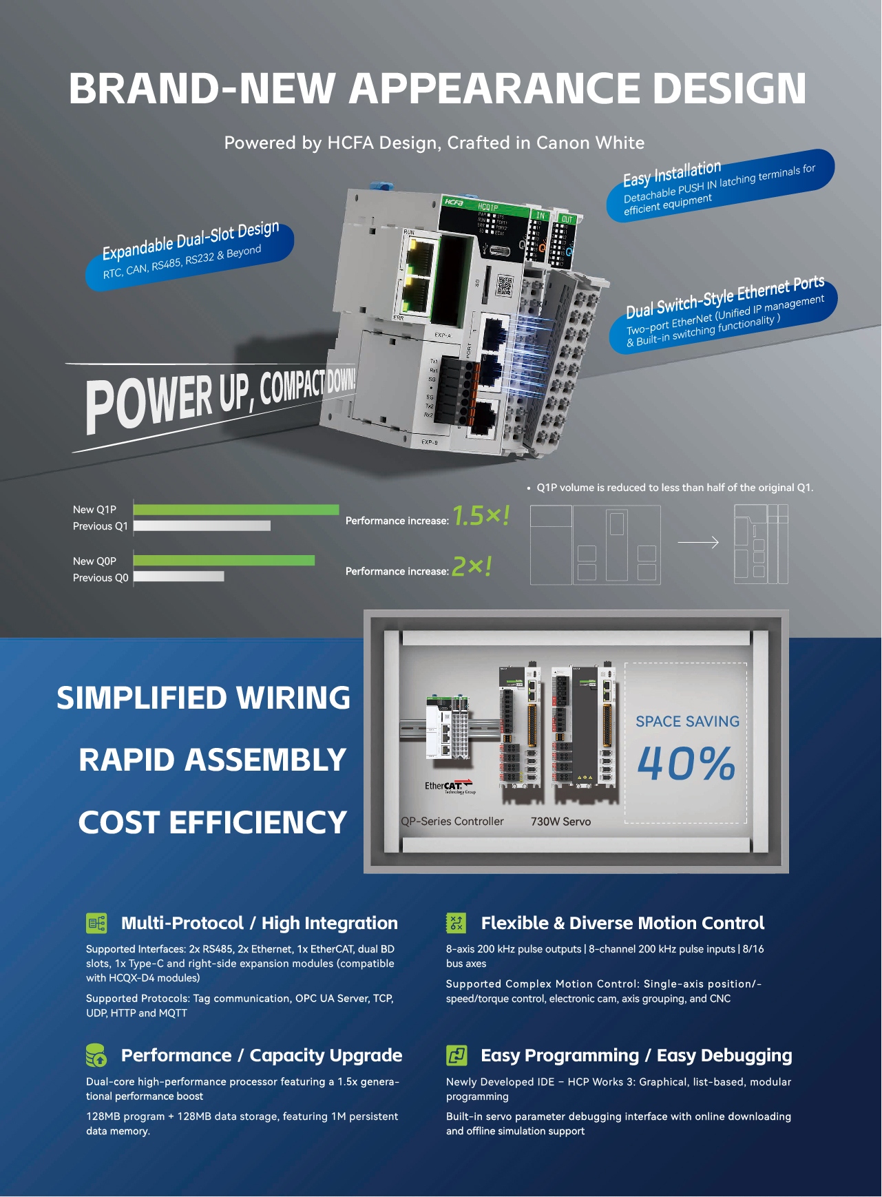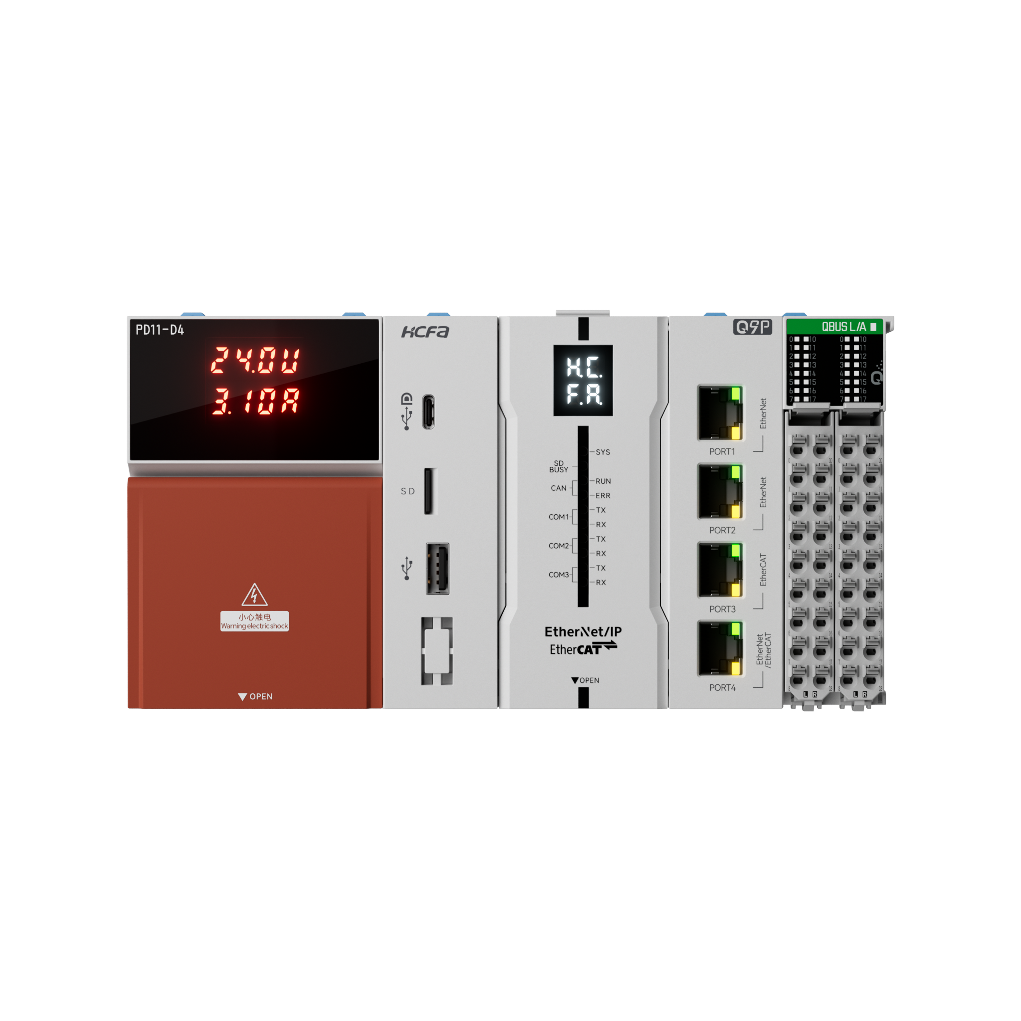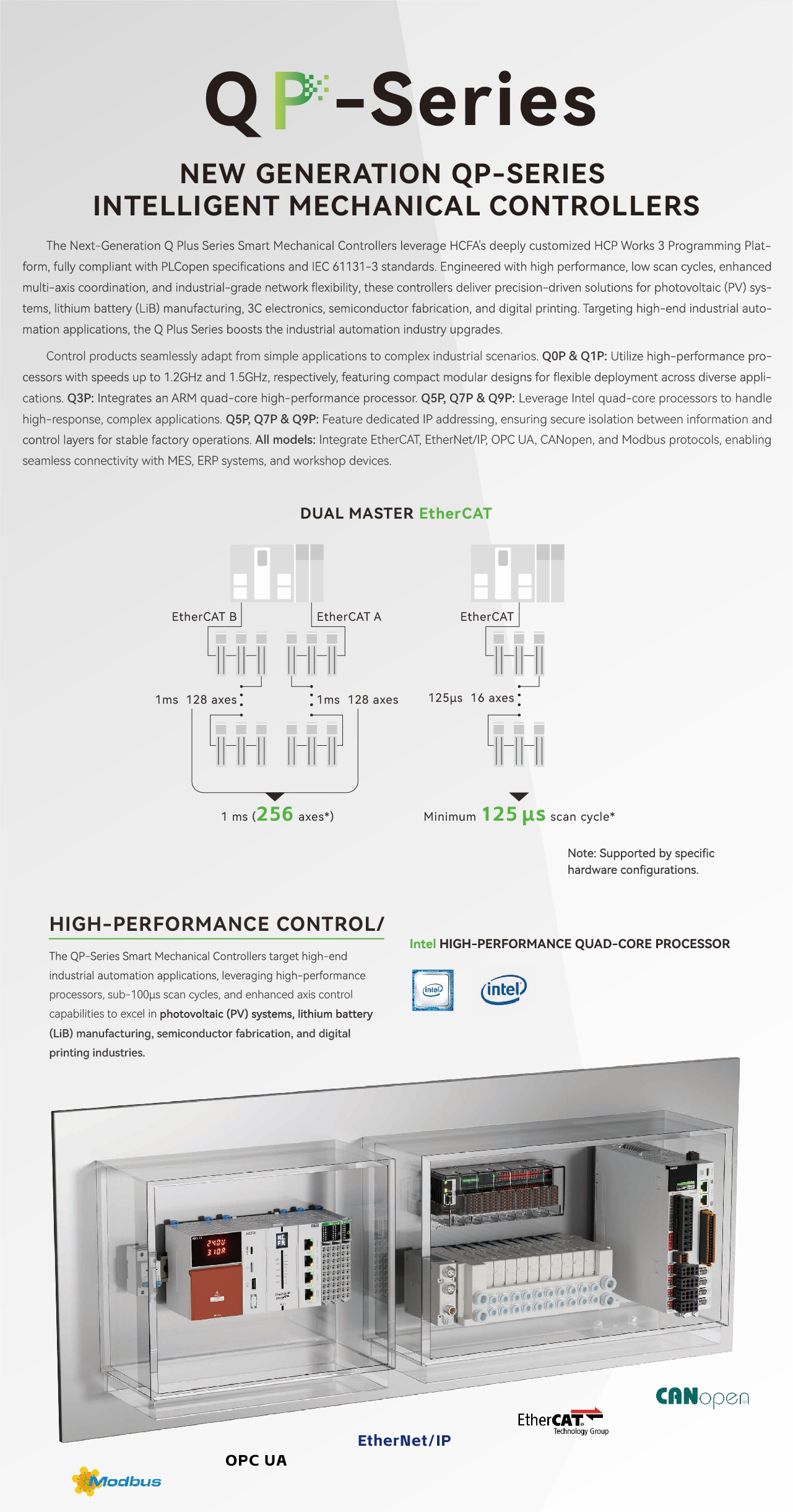 The Q Plus series of control products boasts a richer range of specifications, easily handling everything from simple applications to complex scenarios. The Q0P, Q1P, and Q3P adopt high-performance processors based on the ARM platform, which are sufficient for traditional small and medium-sized device applications. The Q5P, Q7P, and Q9P utilize high-performance quad-core processors from Intel to handle highly responsive and complex application scenarios. The entire series integrates communication protocols such as EtherCAT, EtherNet/IP, OPC UA, CANopen, and Modbus, enabling easy interconnection and communication with MES, ERP, and workshop equipment.