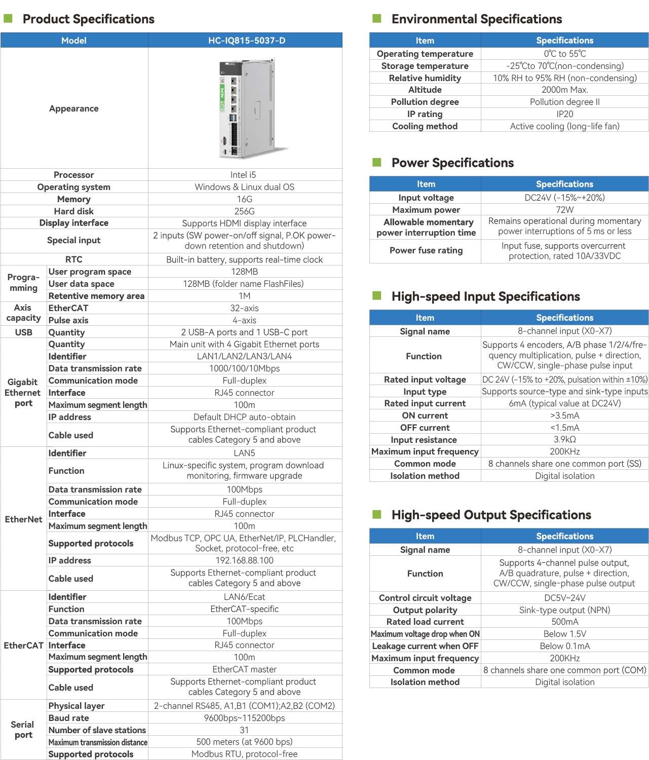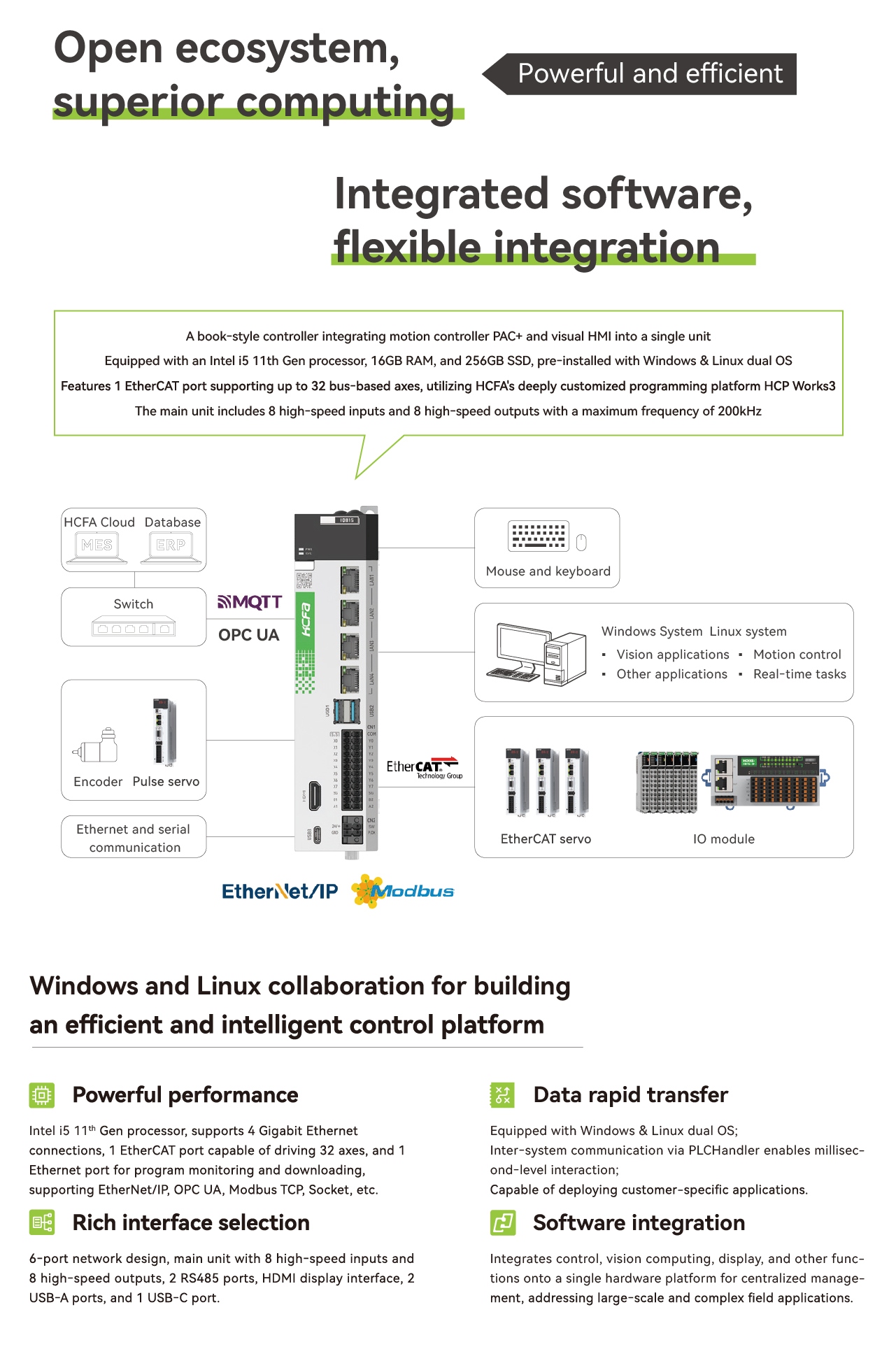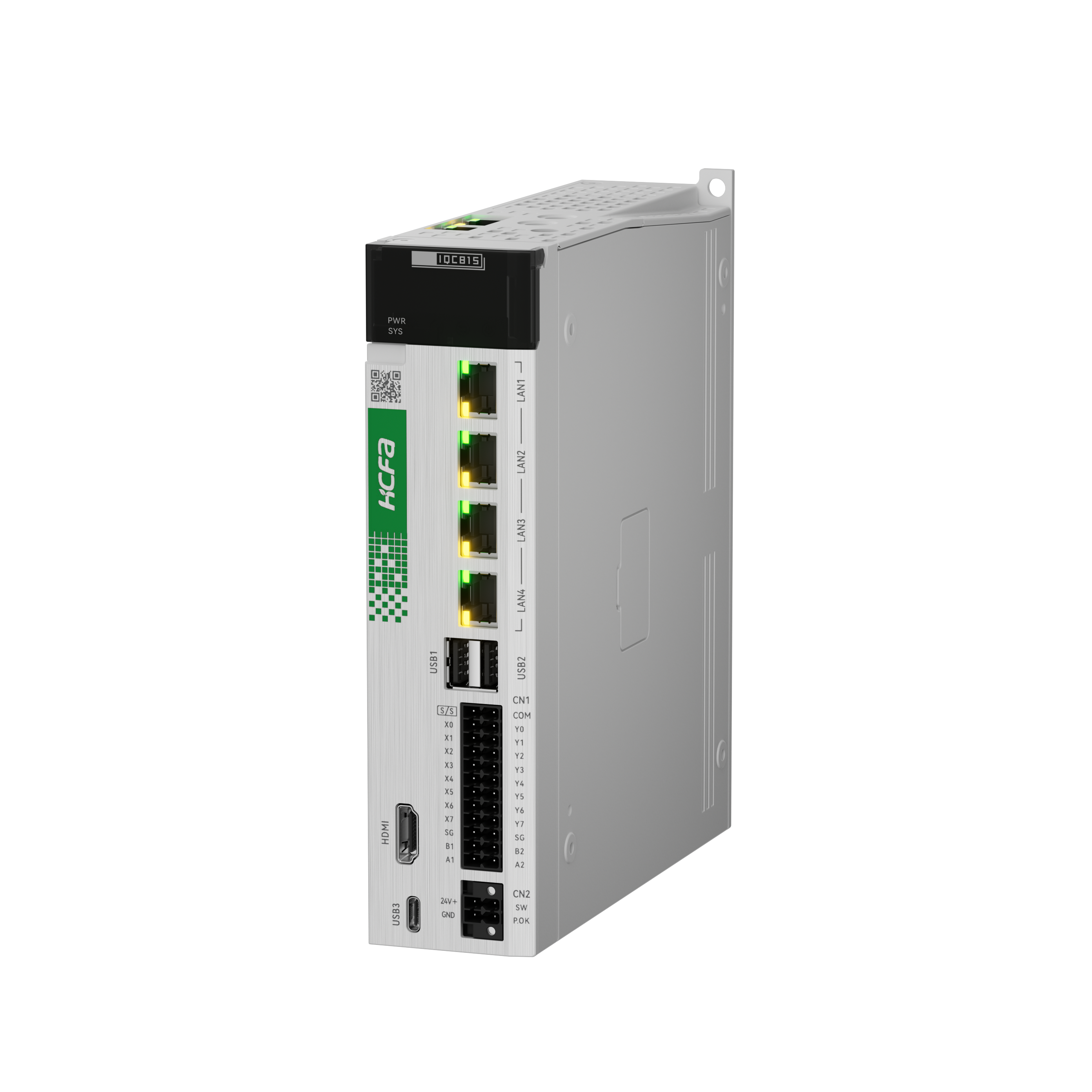 The book-style IPC, IQ800 series, integrates the motion controller PAC+ with a visual HMI into a book-style controller. It utilizes an Intel i5 11th generation processor, 16GB RAM, and a 256GB solid-state drive, pre-installed with Windows&Linux dual systems. It supports one EtherCAT channel, can handle up to 32 bus axes, and employs the programming platform HCP Works3 developed by Hechuan. The main unit comes with 8 high-speed inputs and 8 high-speed outputs, with a maximum frequency of 200KHz.