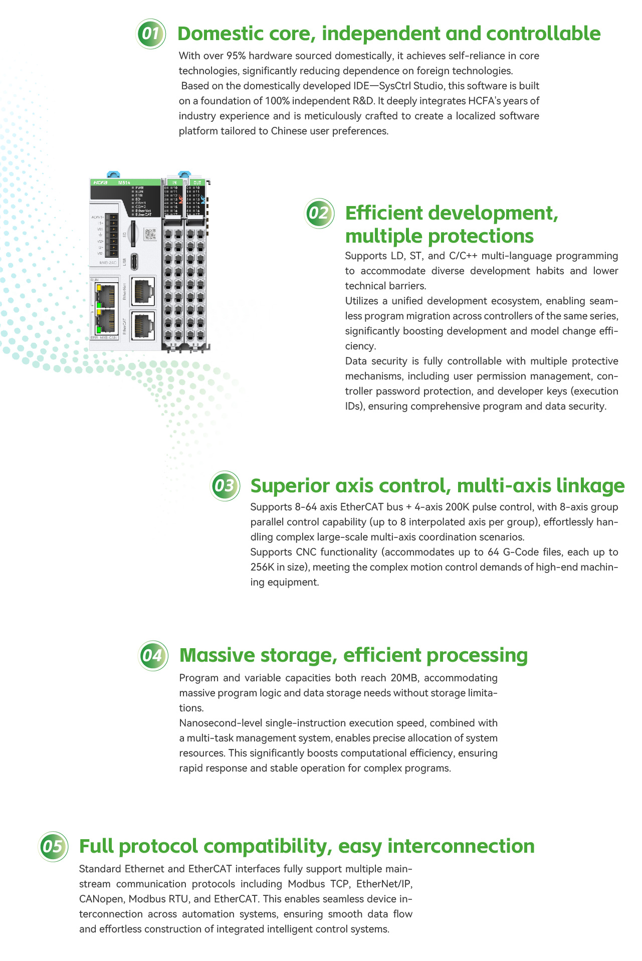 Diverse motion control methods, high-speed and high-precision positioning, up to 64-axis bus, 100% domestically-developed programming platform