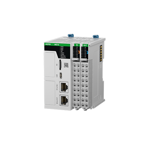 The M500 series is a bus-compatible universal controller, featuring more program and variable space capacity compared to non-500 series. The main body comes with one Ethernet port and two RS485 ports, and can be extended with 16 expansion modules and two BD cards. The M500 can achieve high-speed pulse output for 4 axes + EtherCAT bus for 8 to 64 axes, and high-speed pulse input for 2 channels. It supports single-axis position/speed, electronic gear/electronic cam/axis group/interpolation (linear, arc, spiral), CNC, and other functions.