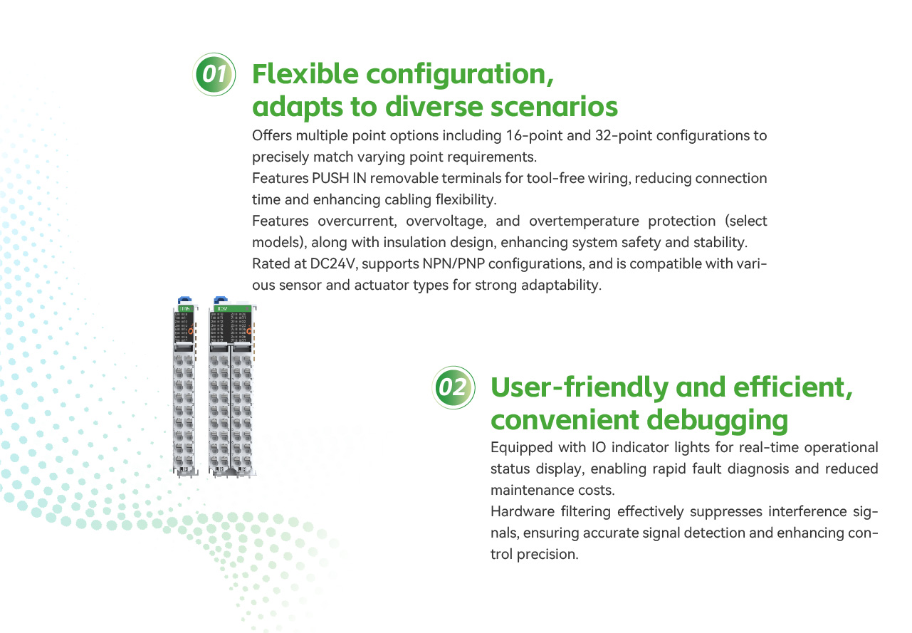 Two models of digital input modules are available, covering 16-point and 32-point digital input configurations. They feature an ultra-compact housing of just 13mm wide and are equipped with detachable PUSH IN (tool-free) terminal blocks for wiring. The modules are compatible with both NPN and PNP wiring types.