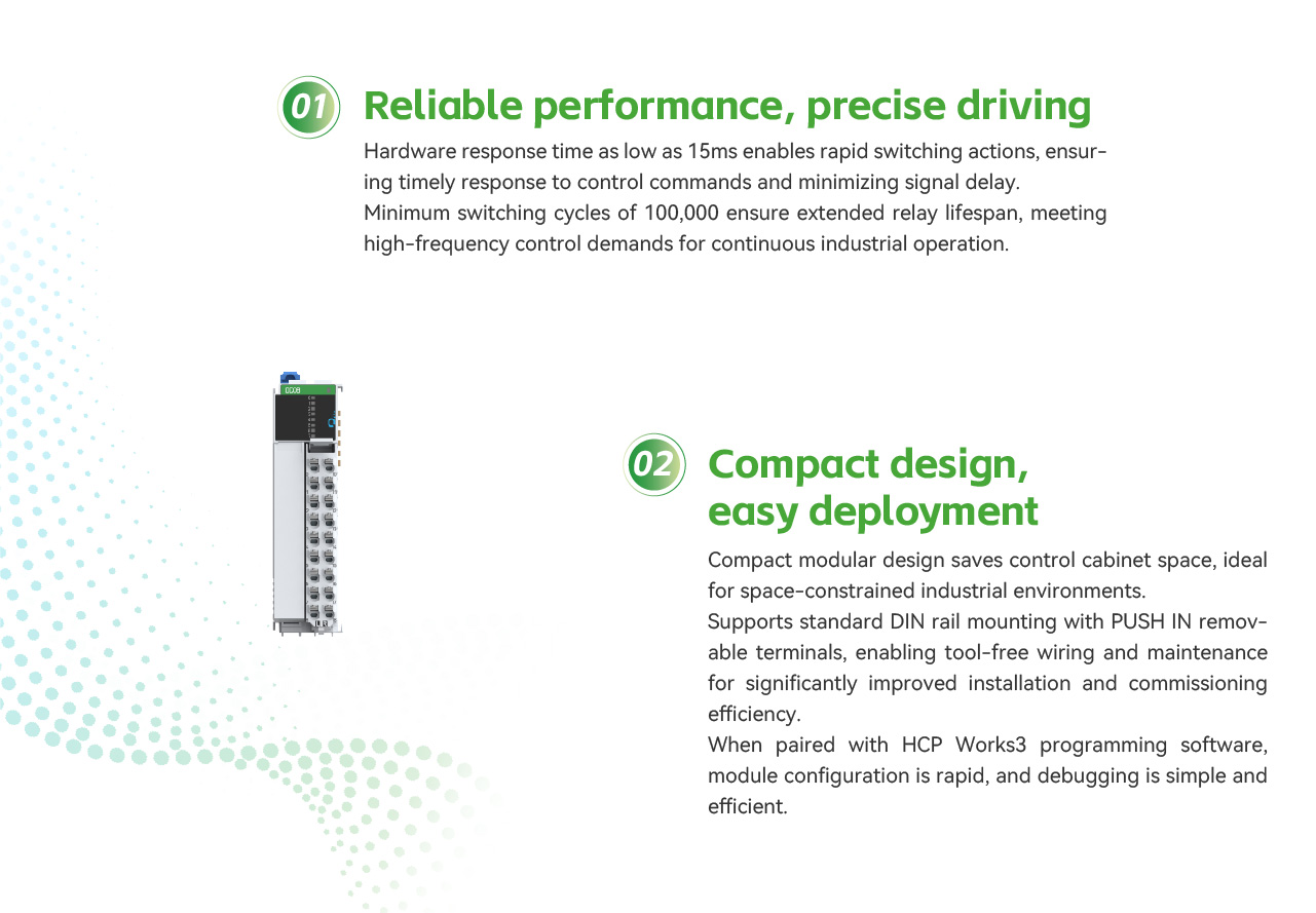 This module features relay output with 8 output channels, equipped with detachable PUSH IN (tool-free) terminal blocks for wiring. It has a rated load current of up to 2A per channel and 16A per module, and supports a rated load voltage of either DC24V or AC220V. The ON/OFF response time is 15ms, with a switching cycle exceeding 100,000 times!