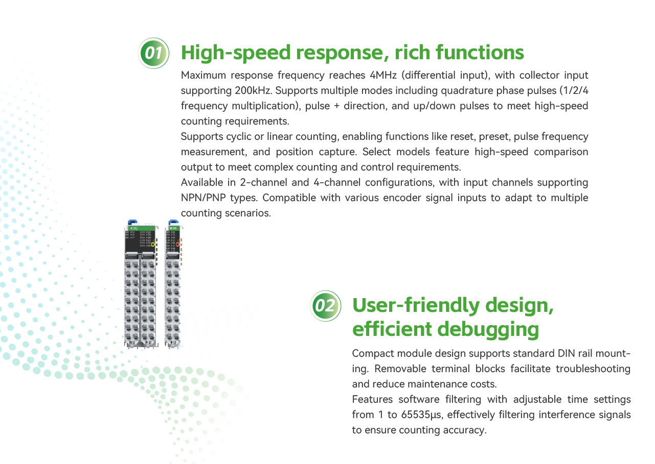 Two models of high-speed counter modules are available, supporting 2-channel 4MHz differential signal input and 4-channel 200KHz collector signal input respectively. These modules deliver ultra-fast response performance: the HC04 has an ON/OFF response time of 2 μs, the HC02 0.2 μs, and the standard IO offers a hardware ON/OFF response time of just 1 μs. They are equipped with a rich set of functions, including pulse frequency measurement, high-speed pulse position latching, and high-speed comparison output.