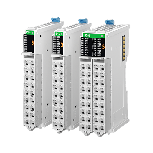Three models of digital input modules cover 8-point, 16-point, and 32-point digital input configurations. The compactest model features a mere 13mm profile, equipped with detachable PUSH IN (tool-free) terminal blocks for wiring. It is compatible with both NPN and PNP wiring types.