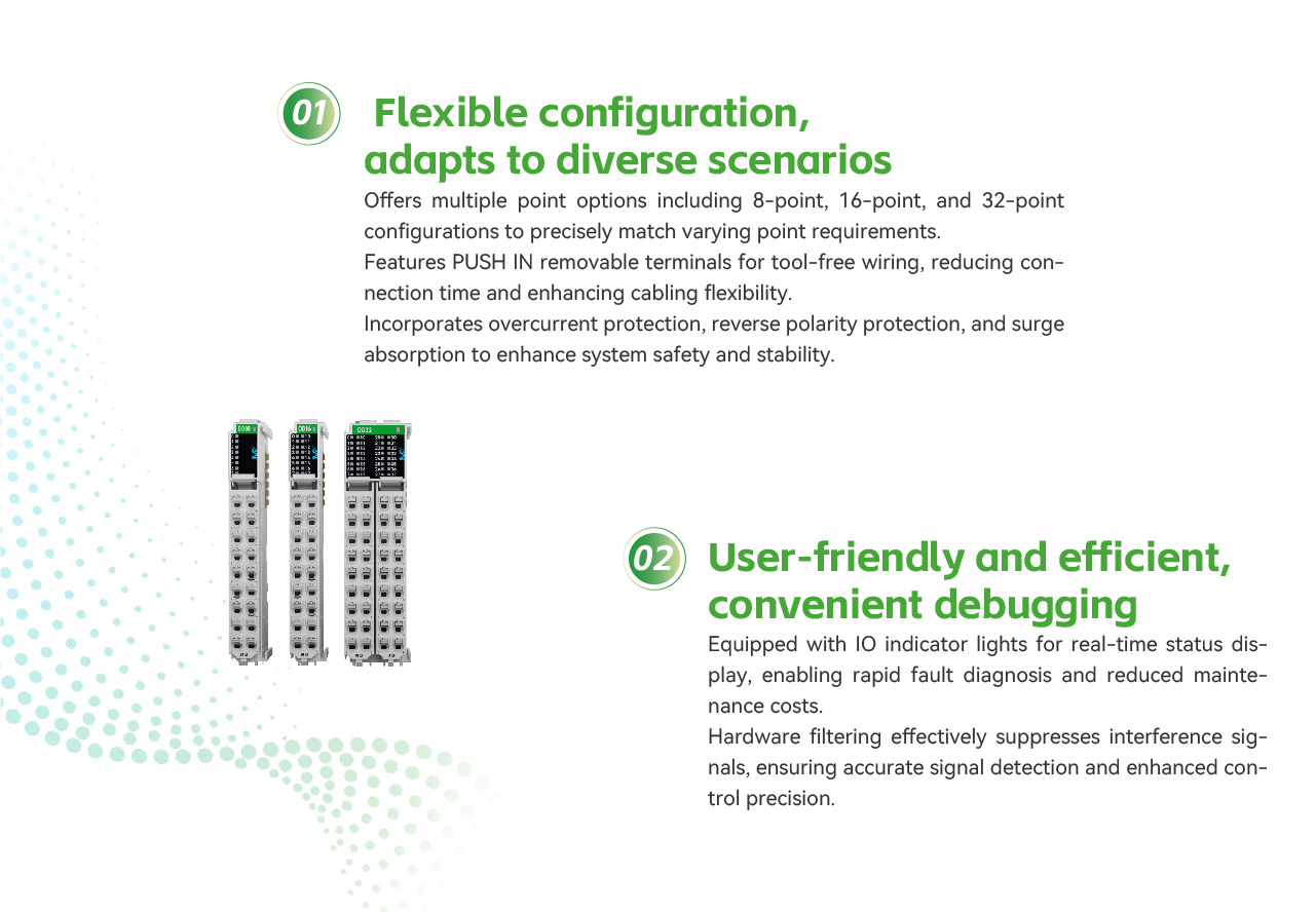 Six models of digital output modules cover 8-point, 16-point, and 32-point digital output configurations. The compactest model features a mere 13mm profile, with detachable PUSH IN (tool-free) terminal blocks for wiring. Supporting both NPN and PNP output types, the appropriate model can be selected based on the operating polarity requirements.