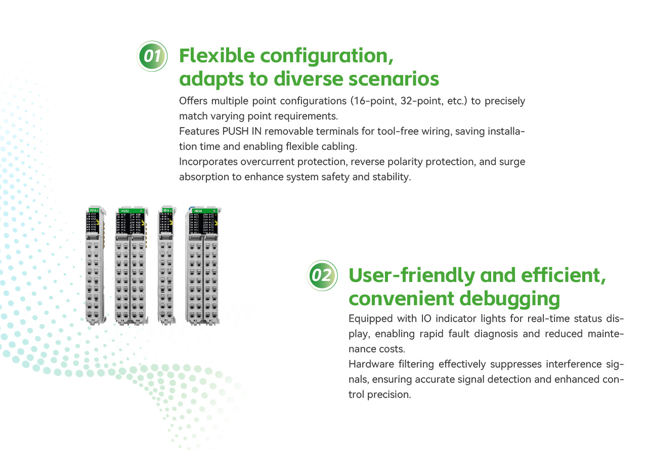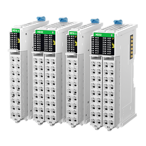 4 types of digital hybrid modules, covering 16 points (8 input points and 8 output points) and 32 points (16 input points and 16 output points) of digital hybrid, with a minimum body size of only 13mm. The terminals are removable and PUSH IN (tool-free) wiring terminals. The output points support NPN or PNP output modes, and the corresponding model can be selected based on the polarity used.