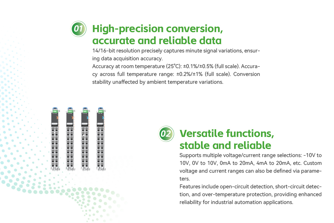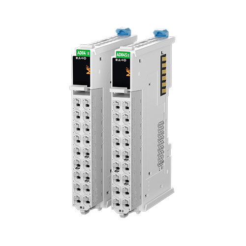 2 types of analog input modules, divided into 4-channel analog inputs with 16-bit resolution and 14-bit resolution, with a minimum body size of only 13mm. The terminals are detachable and PUSH IN (tool-free) wiring terminals. It supports 4 voltage modes and 3 current modes for selection, and supports functions such as software filtering, over-limit detection, and calibration.