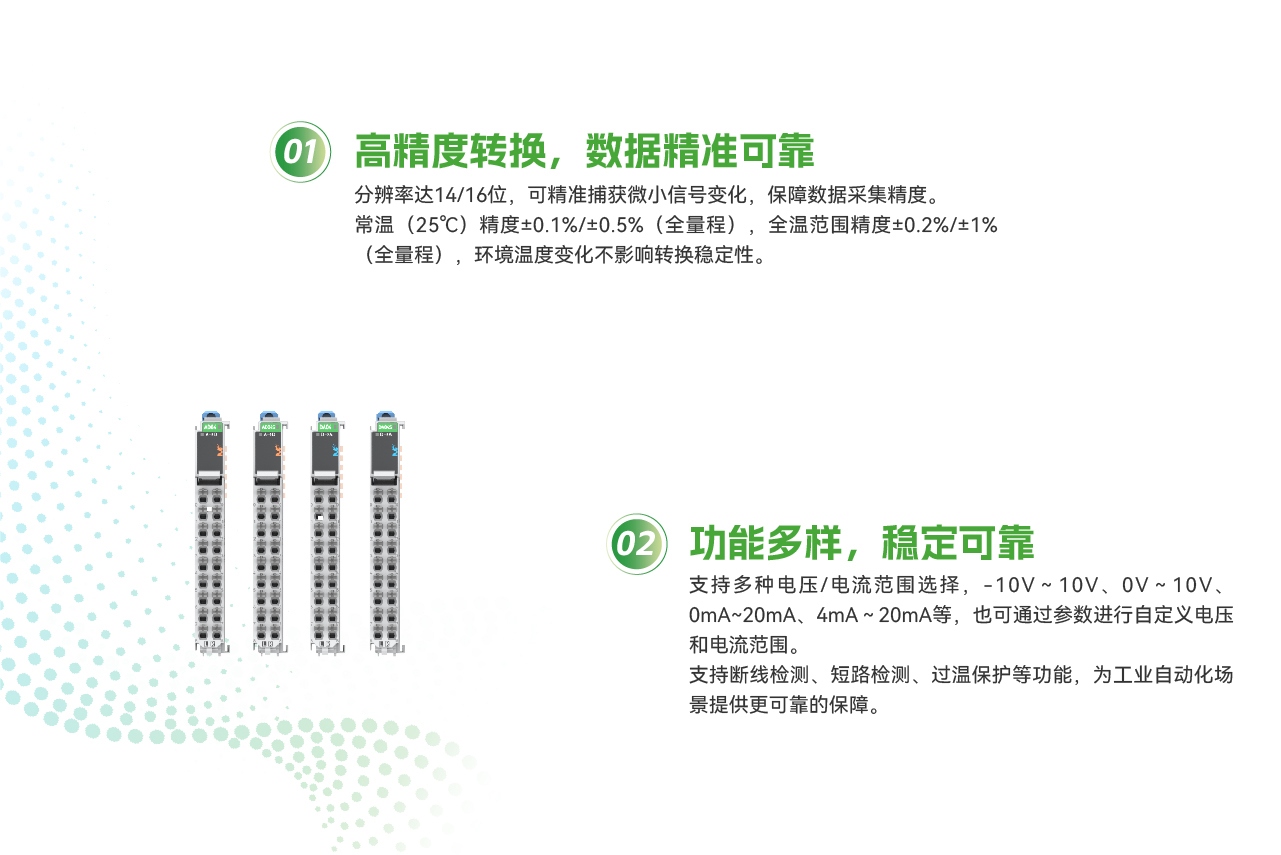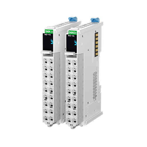2 types of analog output modules, divided into 4-channel analog output with 16-bit resolution and 14-bit resolution, with a minimum body size of only 13mm. The terminals are removable and PUSH IN (tool-free) wiring terminals. It supports 2 voltage modes and 2 current modes for selection, and supports functions such as short circuit detection, open circuit detection, and over-temperature protection.
