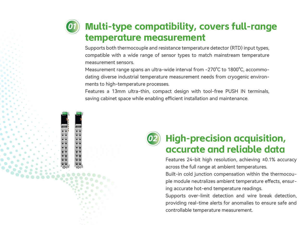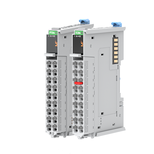 There are two types of temperature modules, which are divided into modules for thermal resistance and thermocouple sensor inputs. They have a resolution of 24bit and an accuracy of ±0.1%. They support functions such as cold junction compensation (for thermocouple type), wire break detection, over-limit detection, channel opening and closing, etc. The terminals are designed with removable and PUSH IN (tool-free) wiring terminals.