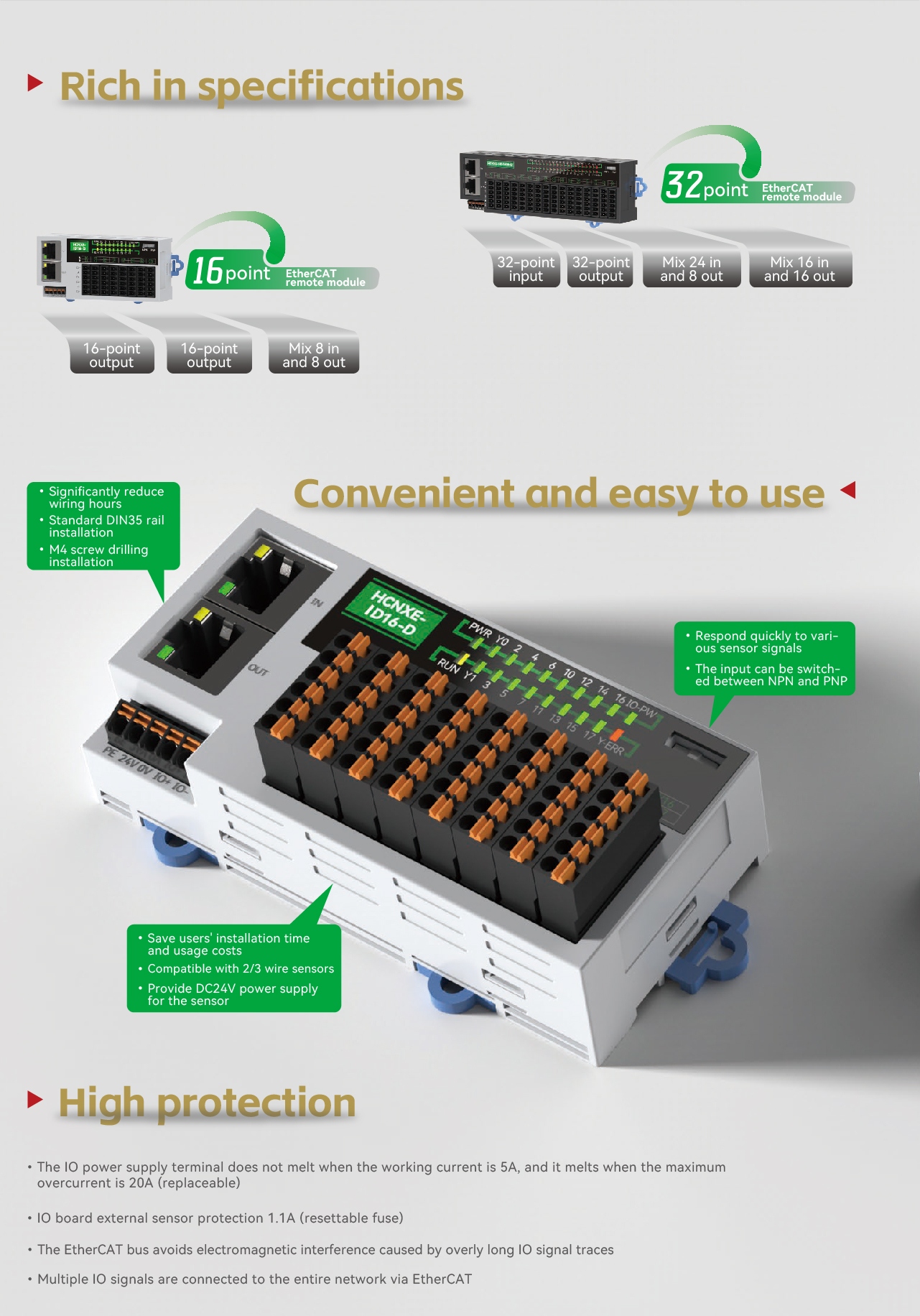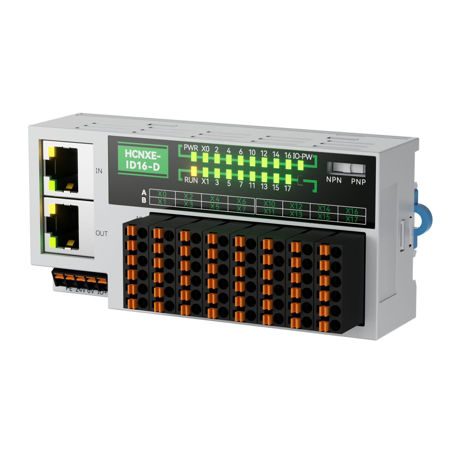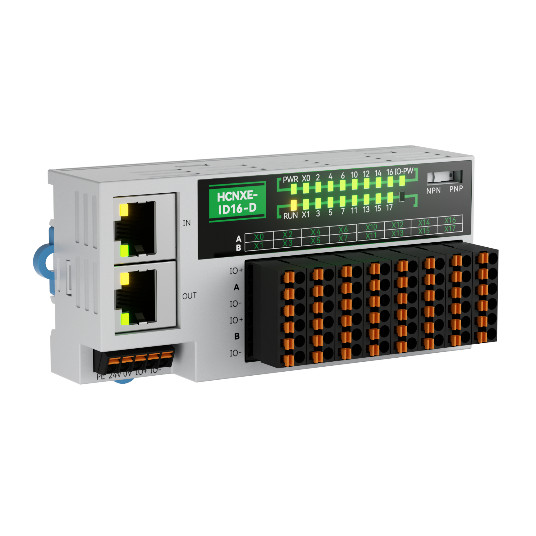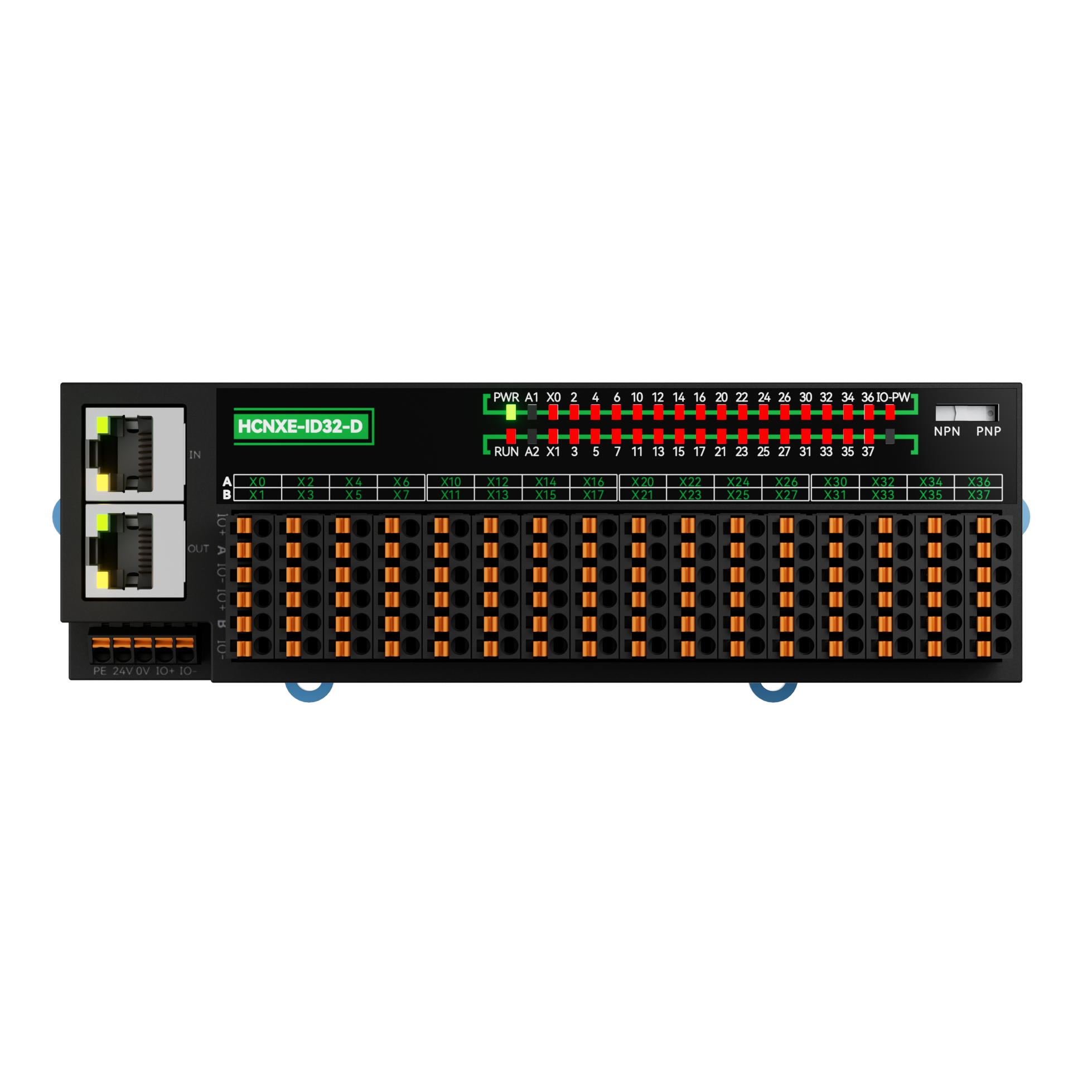 The NXE module boasts a maximum protection level of IP40 (after installing the protective cover), supports external installation in the electrical cabinet, and features a reserved 24V power supply interface for sensors on the main body, allowing for nearby sensor installation. There are two types of digital input modules, namely 16-point and 32-point modules. The module dip switch allows for switching between NPN/PNP, enabling quick response to various sensor signals. With high protection, the IO power supply terminal has a working current of 5A without fusing, and a maximum overcurrent of 20A (replaceable). The IO board provides external sensor protection of 1.1A (with recoverable fuse).