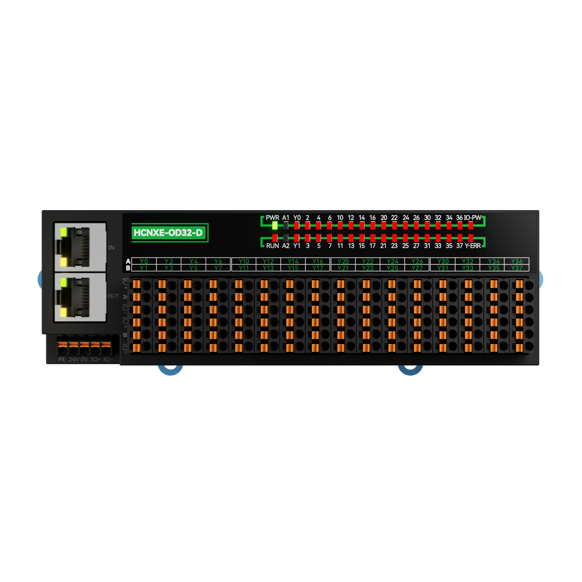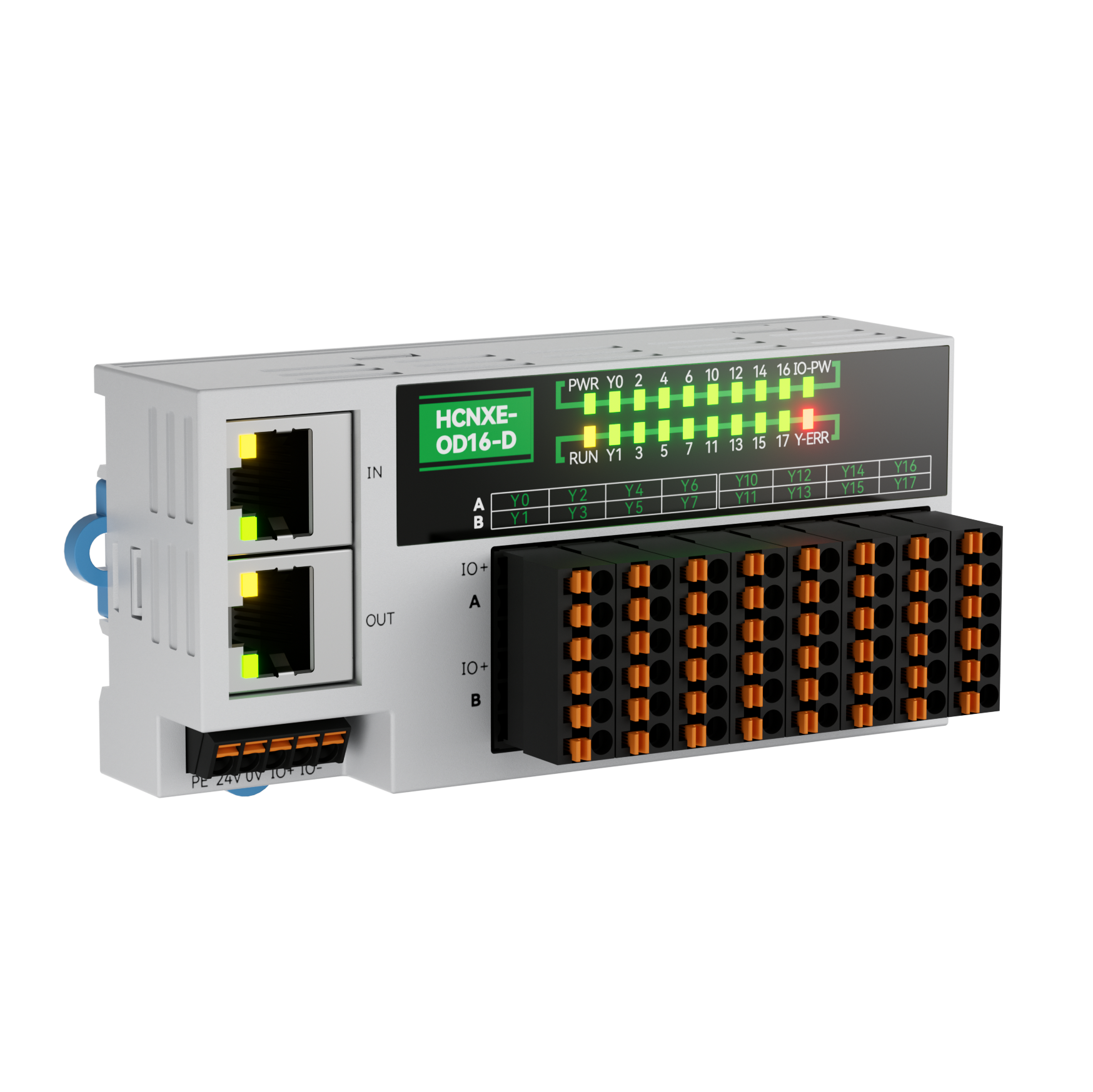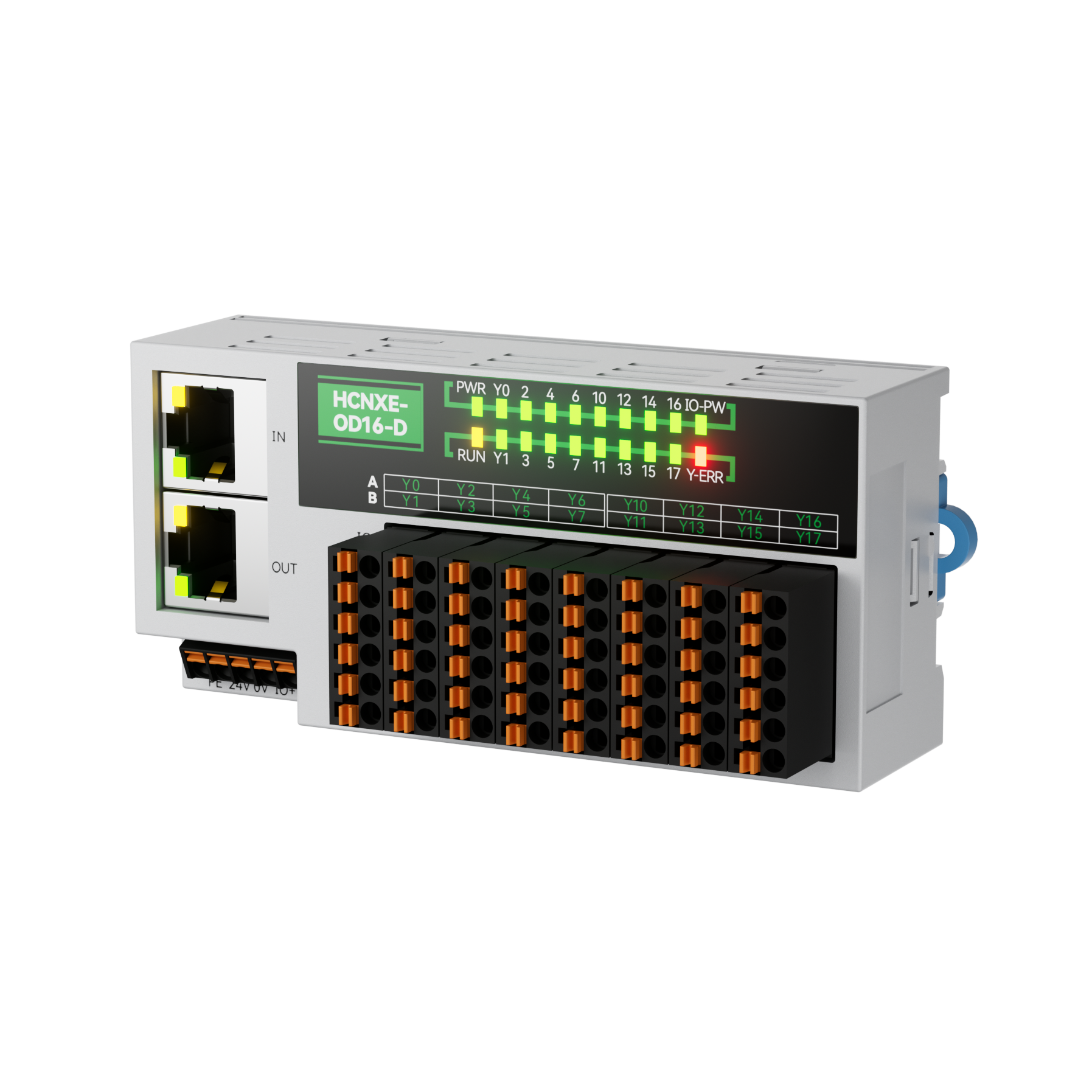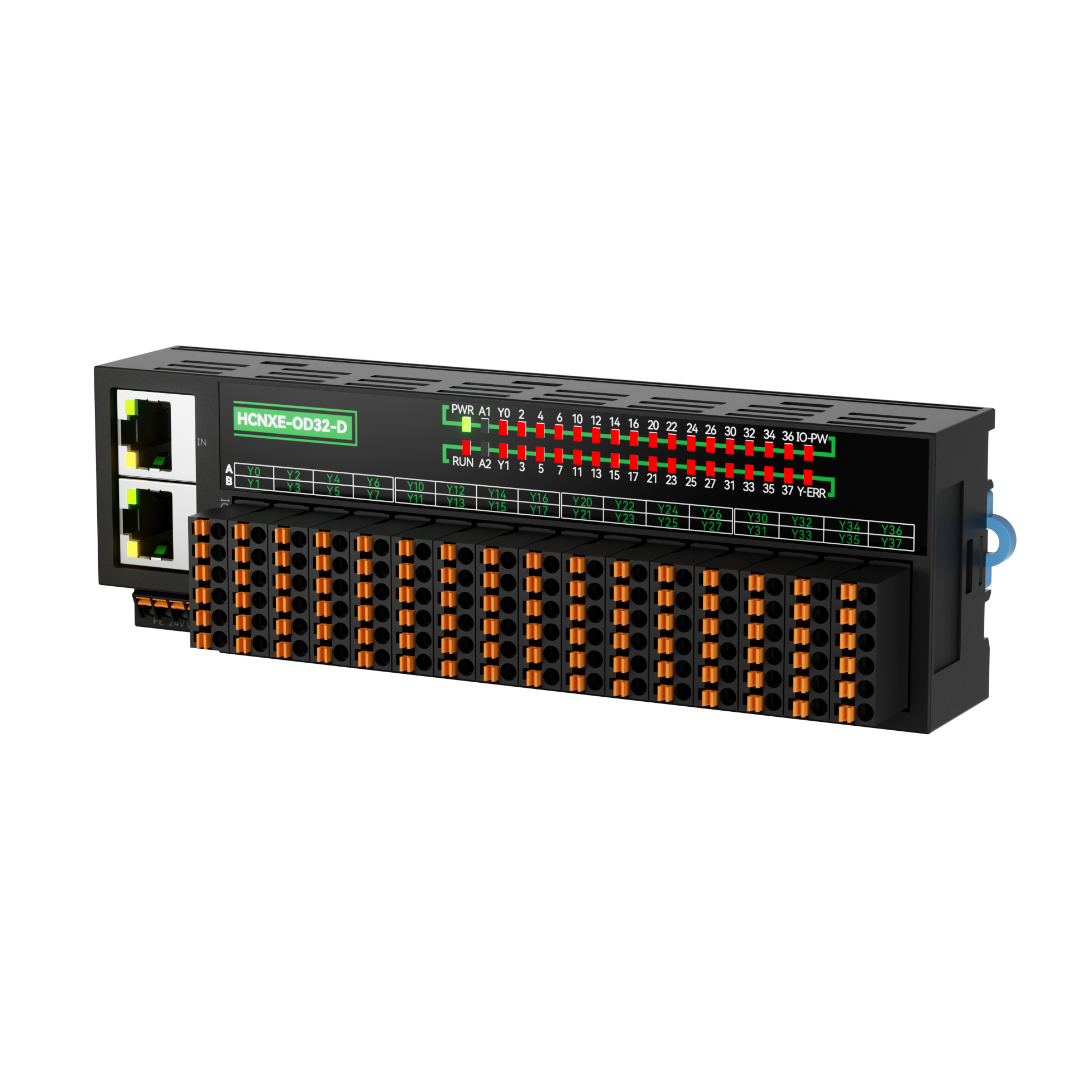 The NXE module boasts a maximum protection level of IP40 (after installing the protective cover), supports external installation in electrical cabinets, and can be installed near the nearest equipment. There are two types of digital output point modules, one with 16 points and the other with 32 points, both of which only support NPN output and a 2-wire wiring method. It features high protection, supporting overcurrent protection, overvoltage protection, overtemperature protection, etc. The rated load current is up to 0.5A per channel, and the rated load voltage is DC 24V (-15% to +20%).